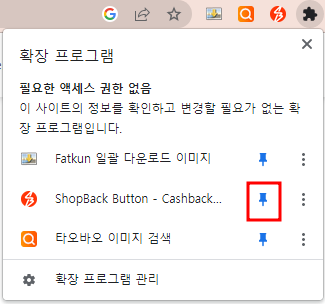 크롬 브라우저 우측 상단의 퍼즐 모양을 눌러 ShopBack 을 고정해주세요.
