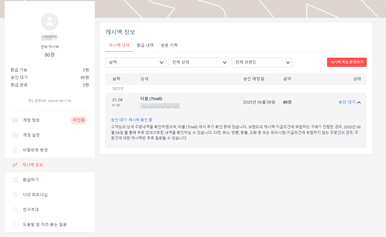 샵백 캐시백 정보에 돌아오면 위와 같이 80원 캐시백이 된 것을 확인 할 수 있습니다.