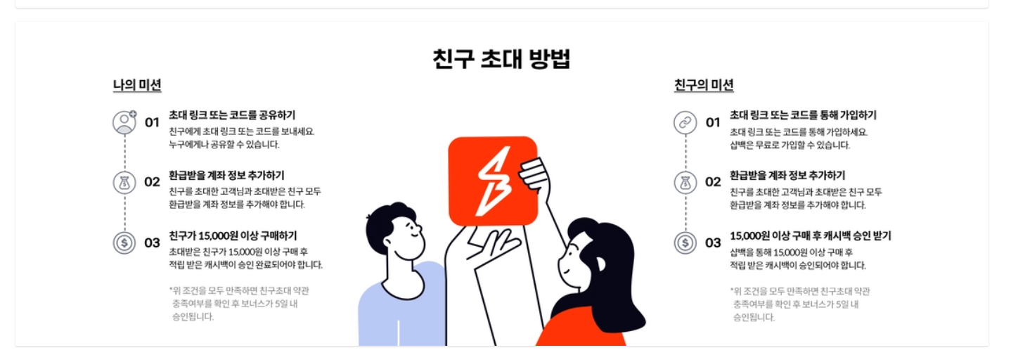 초대 받은 친구가 15,000원 이상 구매 한 후 적립받은 캐시백이 승인완료까지 되어야 합니다.