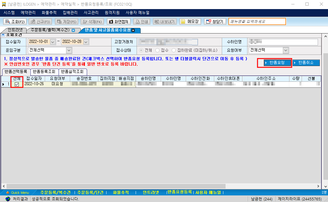 1. 예약관리 → 예약실적 → 반품요청등록/조회