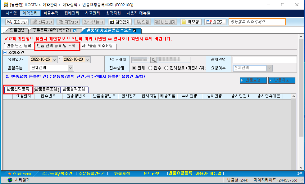 2. 반품 선택 등록 및 조회 → 반품선택등록