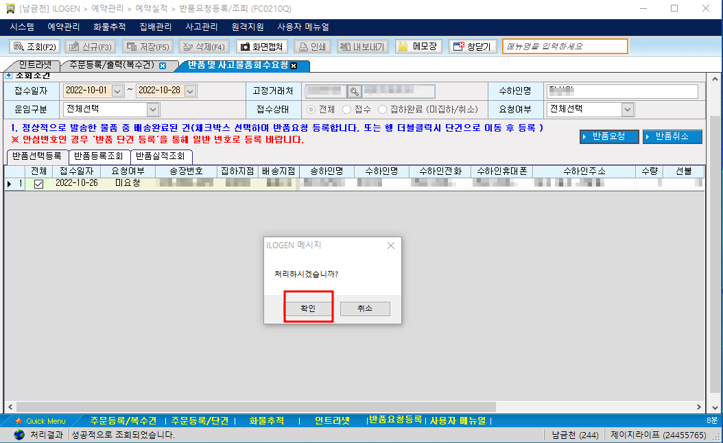 확인 누르시면 정상적으로 반품신청이 완료됩니다.