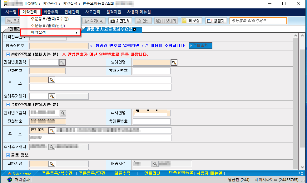 로젠택배 ILOGEN 단건출력(1개씩 등록하여 출력) 방법 ILOGEN 실행 → 예약관리 → 주문등록/출력(단건) 주문번호 입력(선택사항) → 수하인명 입력 → 전화번호 입력 → 휴대폰번호 입력(선