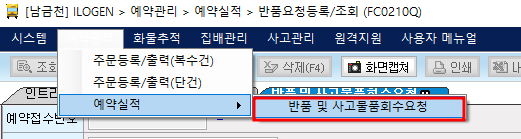 1. 예약관리 → 예약실적 → 반품요청등록/조회