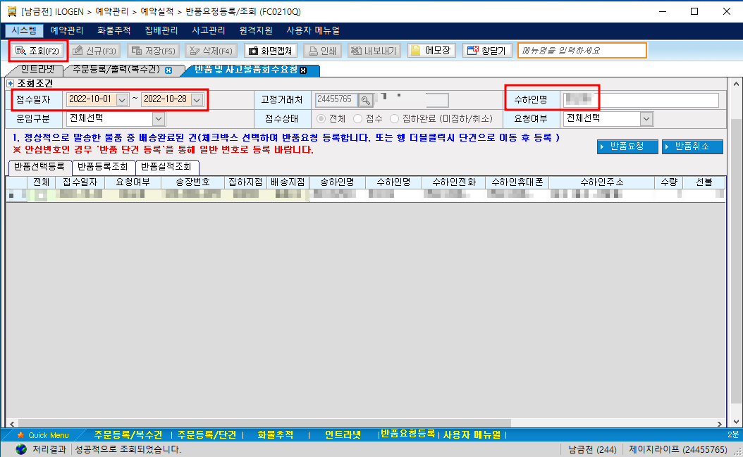 3. 접수일자 선택(보내신 날짜) → 수하인명 기입 → 조회