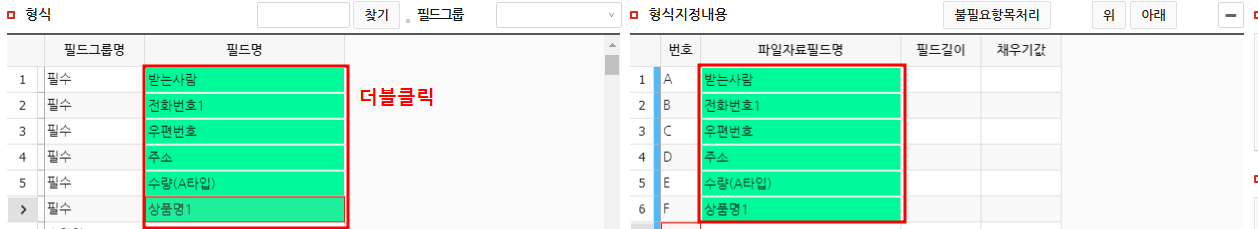 3. 형식에서 필드그룹명에 '필수'라고 적혀있는 옆에 필드명들을 더블클릭 (필수를 넣지 않으시면 엑셀 인식이 안됩니다)