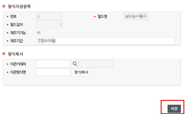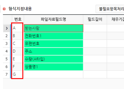 그럼 옆에 보시면 형식지정내용에 파일자료필드명에 더블클릭한 항목이 들어가게 됩니다.