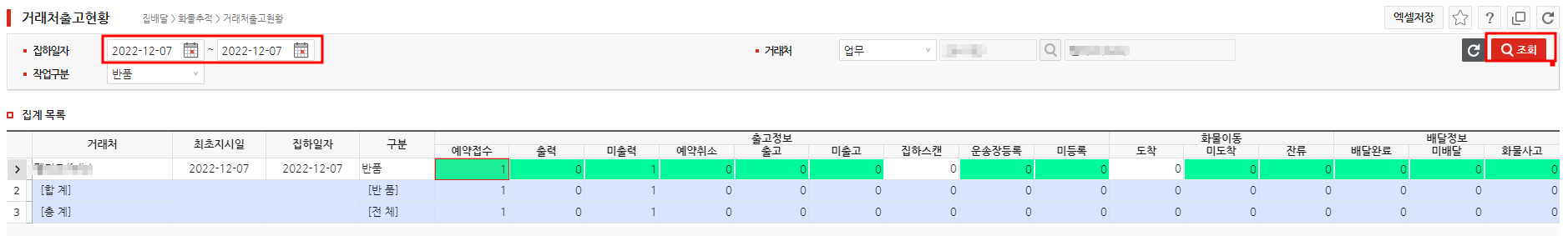 반품접수를 하셨다면 확인은 집배달 → 거래처출고현황