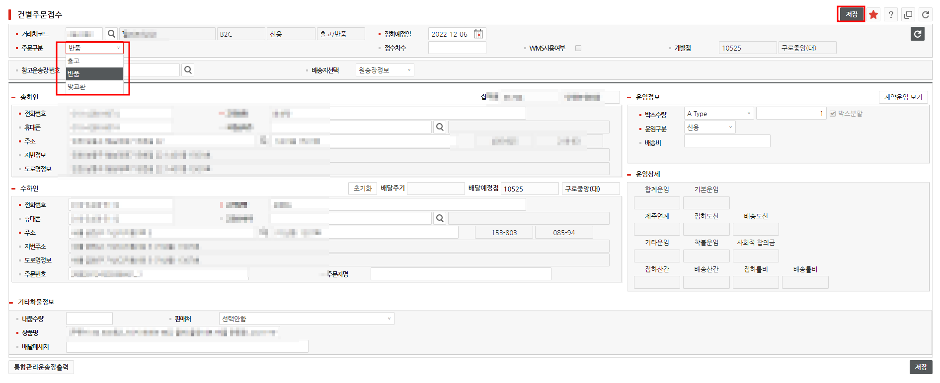 반품접수 클릭하셨다면 아래처럼 정보가 한번 더 보이실겁니다. 여기서 주문구분을 반품으로 설정하시고 저장하시면 됩니다.