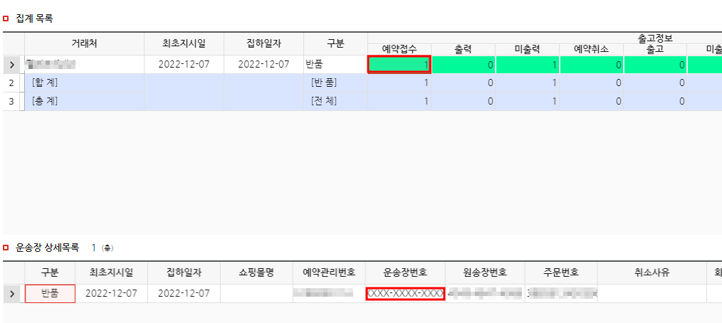 예약접수 밑에 1이라고 있는데 그거 클릭하시면 밑에 운송장 상세목록에 반품접수하신 내역이 뜨실겁니다. 그러나 막 반품신청하셨을때는 운송장번호가 xxxx-xxxx-xxxx 이렇게 보이실겁니다. 이건 아직 기사님께서 수거하시지 않으셔서 송장번호가 안나온거라 다음날에 기사님께서 수거하시면 송장번호가 보이실겁니다.