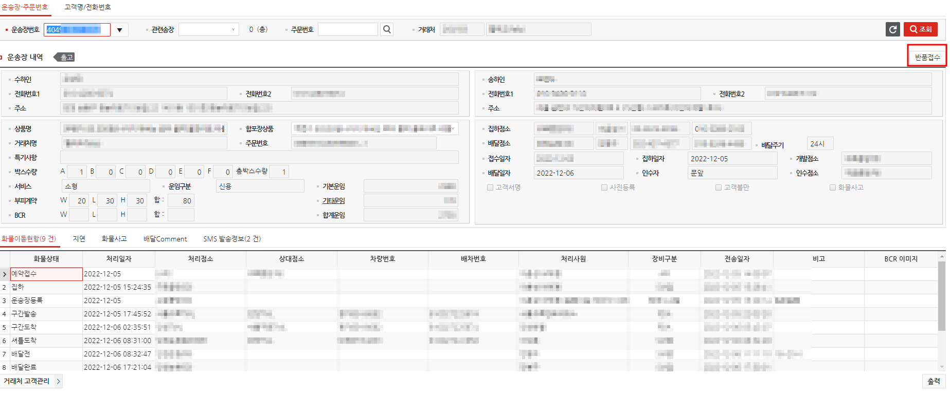 조회하셨다면 수하인, 송하인 정보가 보이실겁니다. 수하인과 송하인 정보를 잘 확인하시고 반품접수 눌러주시면 됩니다.
