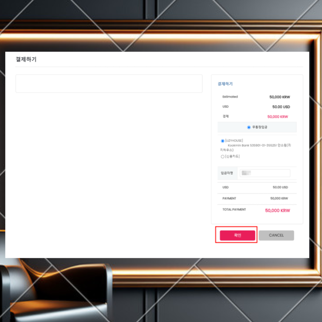 리지하우스 계좌이체를 진행하거나 추후 가능할 신용카드 등으로 충전이 가능합니다. 추후 트래킹번호를 입력하거나 신청했던 주문서를 확인하려면 마이페이지에서 볼 수 있습니다.
