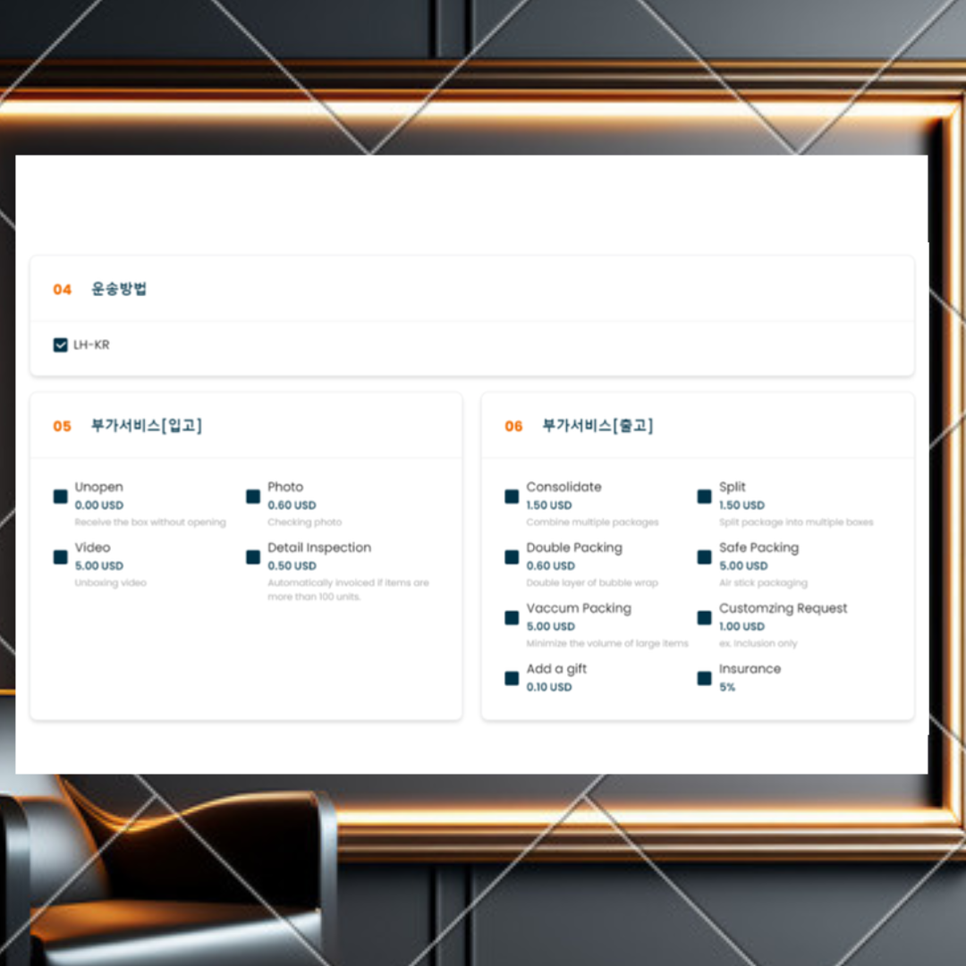 부가서비스로는 입고 및 출고로 구분되어 있습니다. 출고서비스에 기프트나 커스터마이징 등이 있어 다양하게 활용해 볼 수 있습니다.
