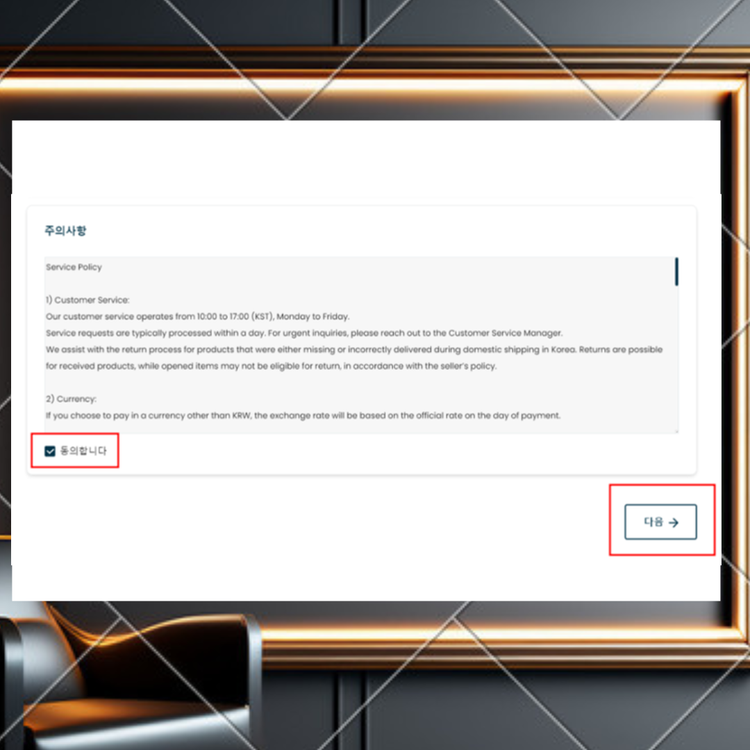 주의 사항에 대한 동의 버튼 클릭 후 다음으로 진행합니다.