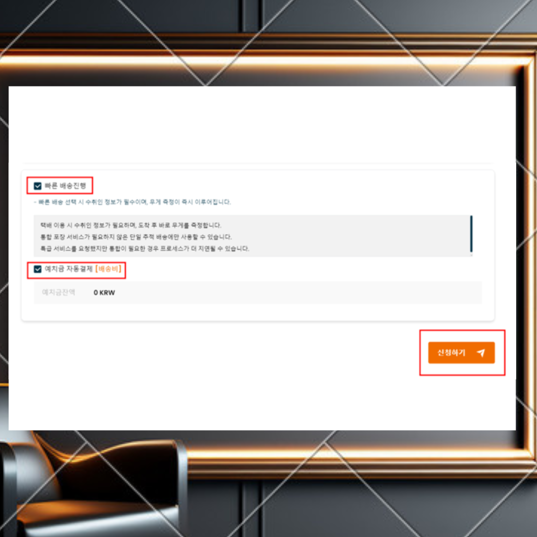 빠른 배송은 예치금 자동결제로 진행됩니다. 제품 도착 후 바로 무게를 측정하여 빠르게 출고될 수 있습니다. 당연히 예치금이 부족하면 출고가 진행되지 않습니다.