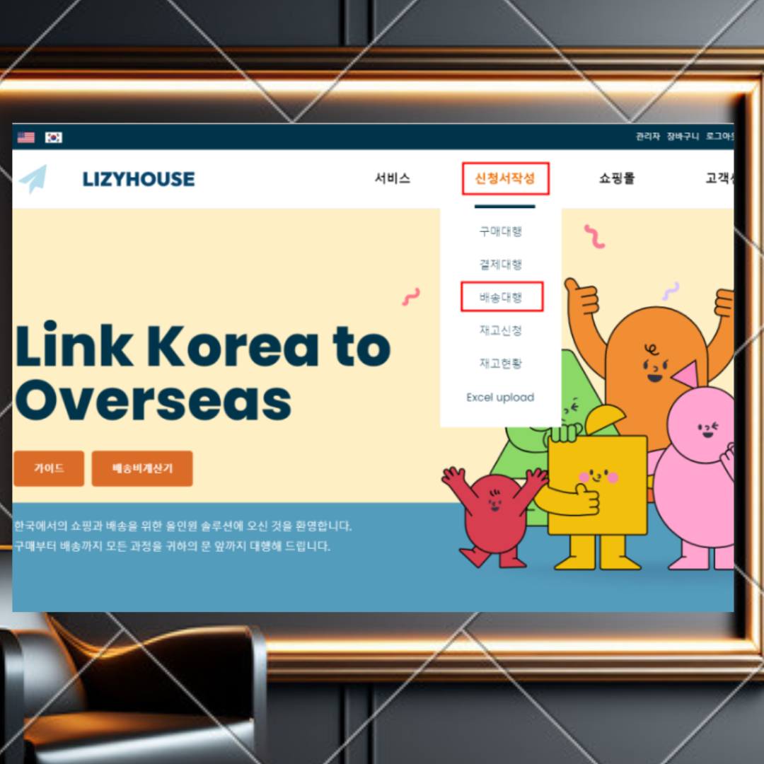 신청서는 홈페이지 중앙의 신청서작성 탭에서 '배송대행' 메뉴를 클릭합니다.