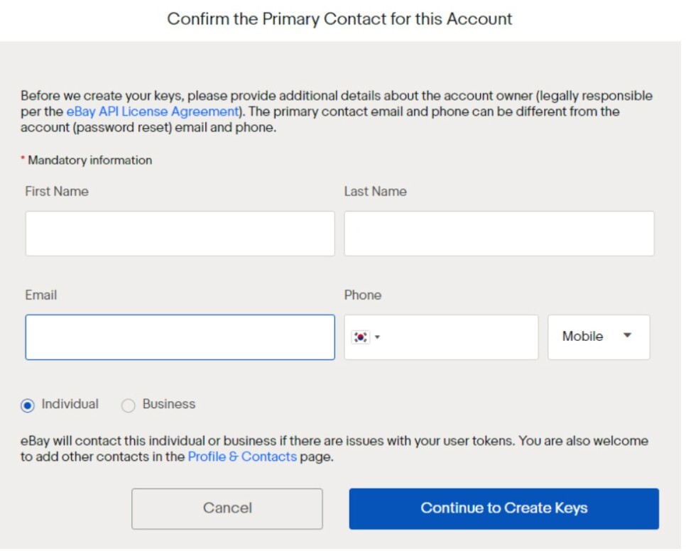 해당 창에 성 이름 이메일 전화번호를 기입하시고 파란색 창(Continue to Create Keys)을 클릭해주시면 됩니다.