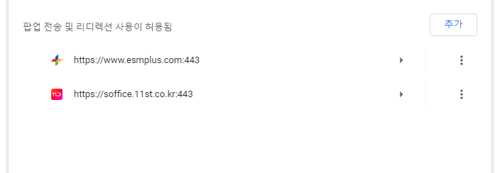 팝업 전송 및 리디렉션 사용이 허용됨 우측 부분 추가를 누르셔서 [*]. cafe24.com을 추가해주시면 됩니다.