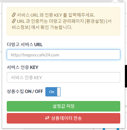 해당란으로 진입해줍니다. 더망고 서비스 URL과 서비스 인증 KEY란이 보일 텐데요! 더망고 프로세스 환경설정에 들어가시면 서비스 정보량과 서비스 인증 KEY가 기입되어 있을 겁니다. 주의사항은 두 개다 복사 붙여 넣기가 안되서 기입이 불편하신 분들은 메모장에 URL과 KEY 를 복사하셔서 붙혀넣기 하시고 해당되지 않는 내용을 지워주시면 됩니다. 기입 완료 후에 상품 수집 ON/OFF 란이 On으로 되어 있는지 확인을 하시고 설정값 저장을 진행해줍니다.