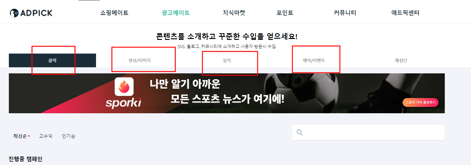 클릭형, 영상/이미지, 설치, 예약/이벤트 등 다양한 광고가 준비되어있습니다.