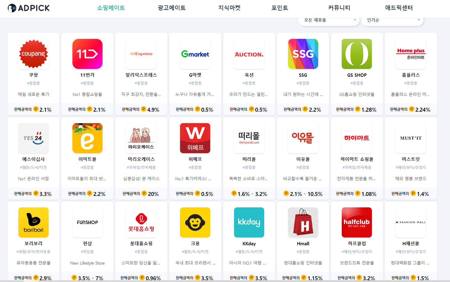 쇼핑메이트에 들어오면 여러가지 제휴몰이 입점이 되어있는 걸 확인할 수 있습니다. 우리는 본인이 홍보하고 싶은 사이트의 상품을 아무거나 골라서 홍보를 할 수가 있는데요,