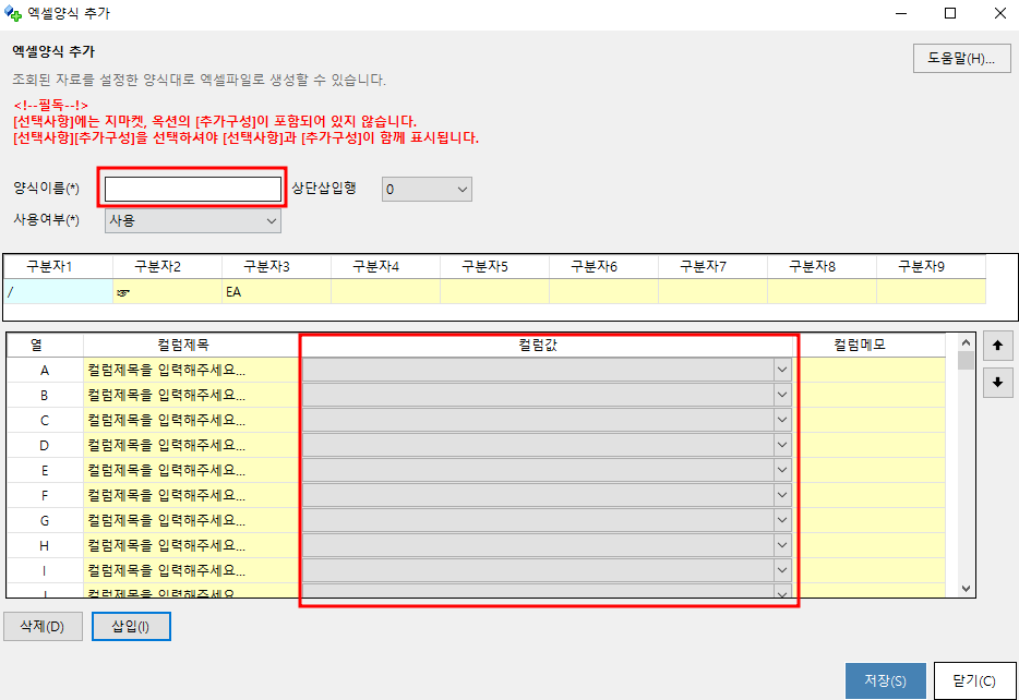 첵크박스 선택 후 엑셀파일생성하시면 맞춰진 양식대로 엑셀파일이 만들어집니다.