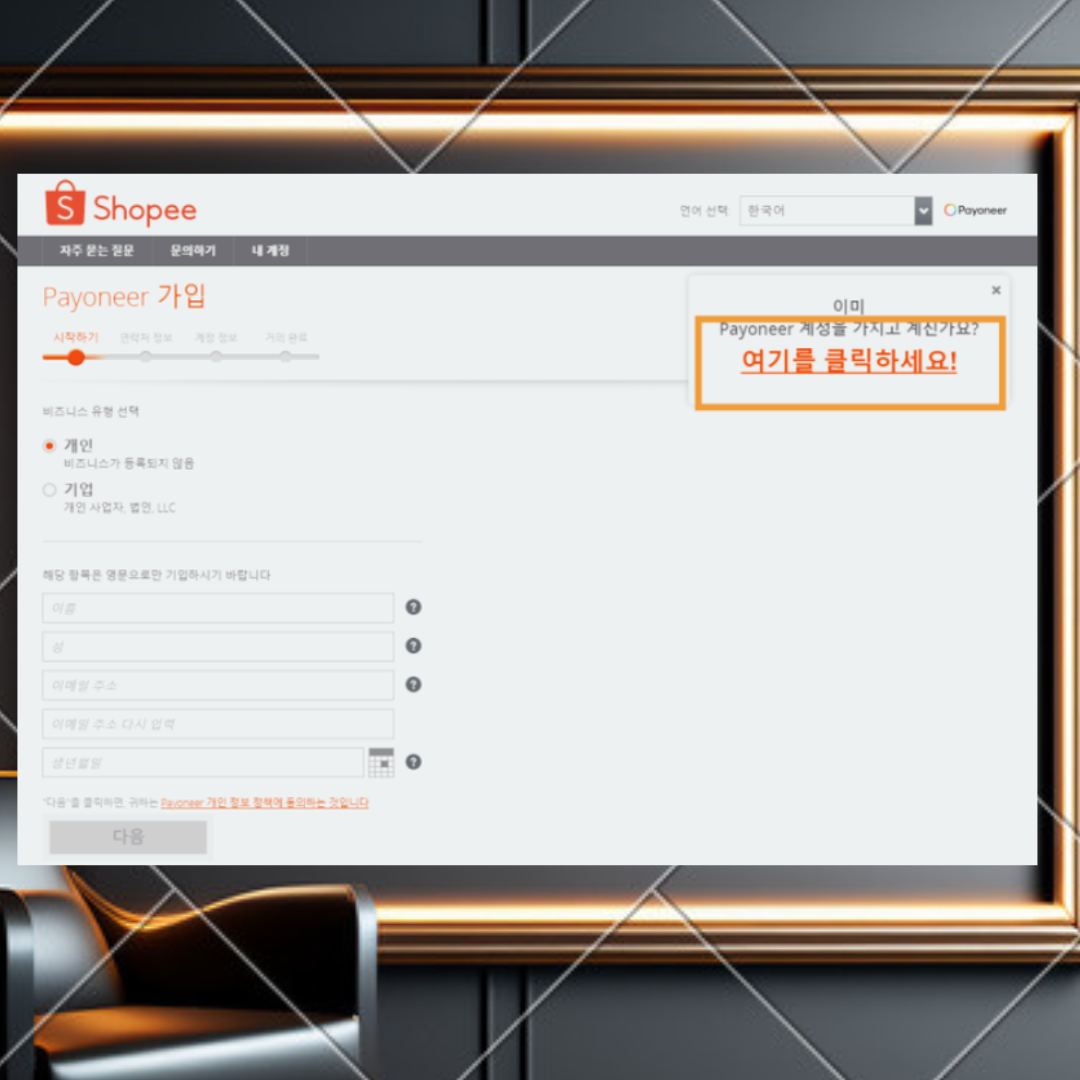 가입은 페이오니아 Payoneer에서 할 수 있습니다. 가입 절차는 간편해서 패스하고, 쇼피 코리아로 가보겠습니다.