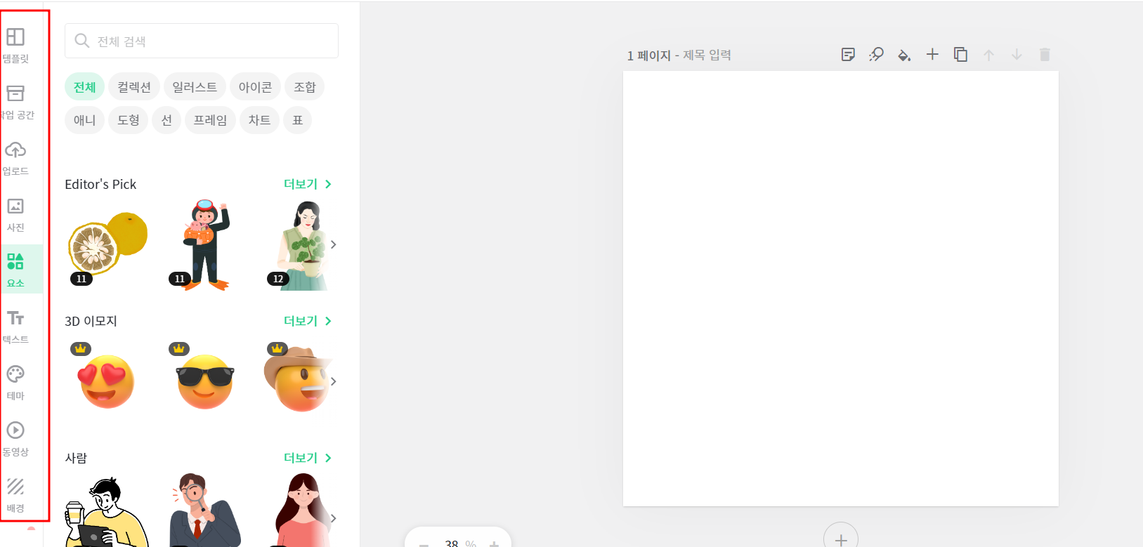 미리캔버스 만들기 화면에서 좌측을 보시면 다양한 메뉴 영역들이있어요!