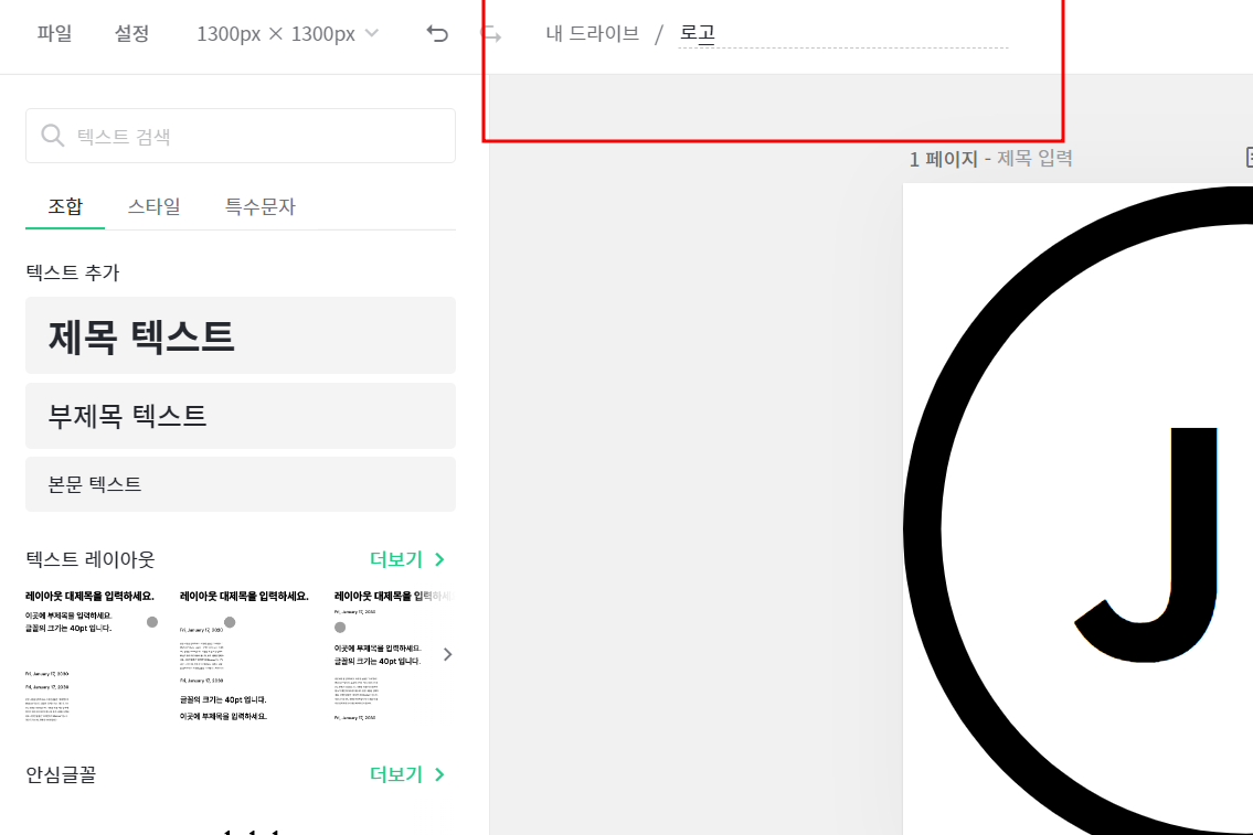 로고에서 사진을 불러와주세요! 아래보시면 권장사이즈는 1300 이라고 나와있죠 ?