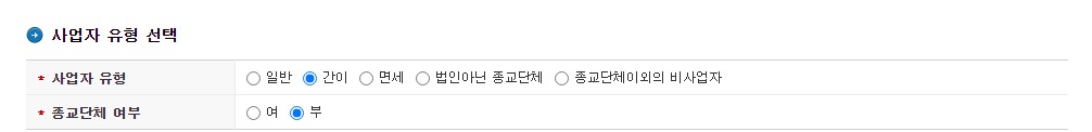 사업자 유형 선택란은 간이과세자로 선택합니다.