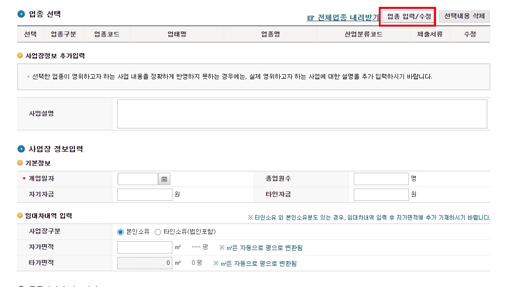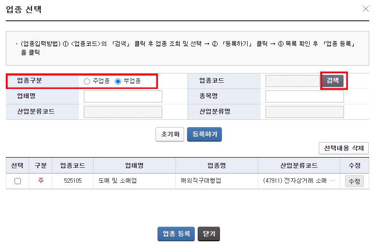 업종 선택란에 업종 입력/수정 눌러주시고 업종코드 검색 눌러주세요.