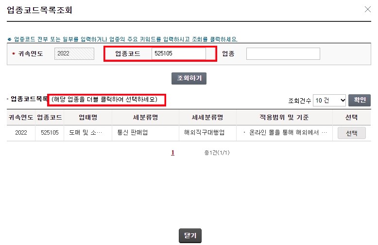 업종코드 525101 조회 후 도매 및 소매업/ 통신판매업 업종 더블클릭하여 선택 합니다.