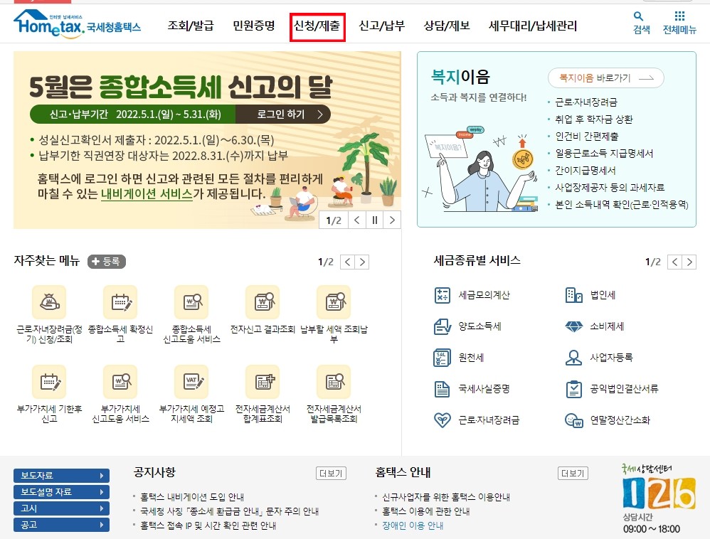 홈택스에 들어가신 후 상단에 신청/제출 항목을 눌러줍니다.