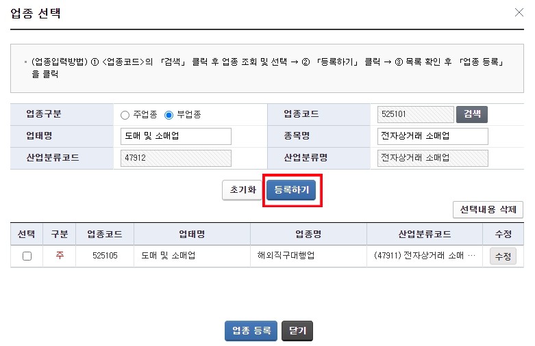 마찬가지로 등록하기 누르게 되면 위 사진처럼 주업종/ 부업종 추가 된걸 확인 할 수 있습니다.