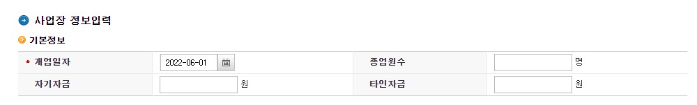 개업일자를 선택 후 종업원수/ 자기자금/ 타인자금 기재하시면 됩니다.
