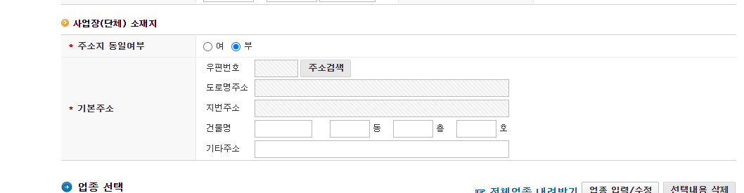사업장 소재지를 부로 체크해주세요! (혹 민증상 주소랑 같다면 '여' 버튼을 누르면 편하세요!)