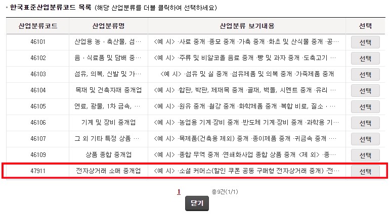 더블클릭하게 되면 산업분류코드가 나오는데 맨 밑에 47911 선택해줍니다.