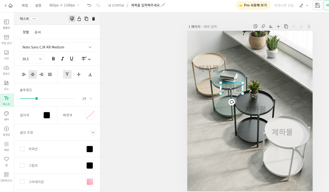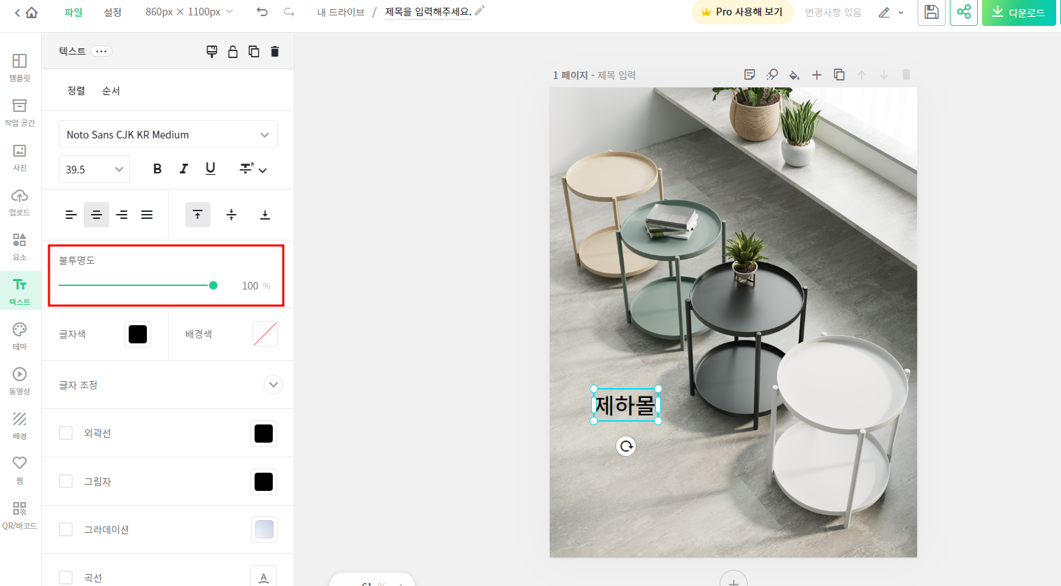저는 제하몰 적어줬구요. 그 다음 왼쪽 불투명도를 줄여 줍니다.
