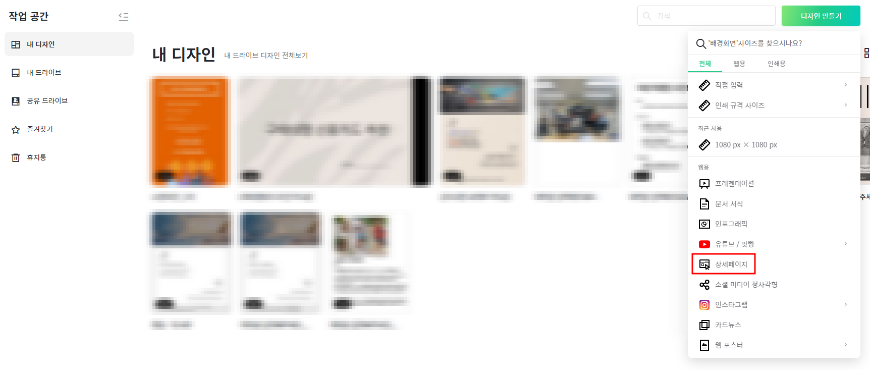 디자인 만들기 > 직접 입력 > 860 x 1100 또는 상세페이지를 선택해줍니다.