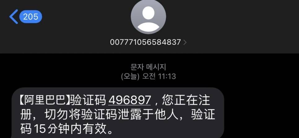 알리바바에서 친절하게 인증코드를 보내줍니다.