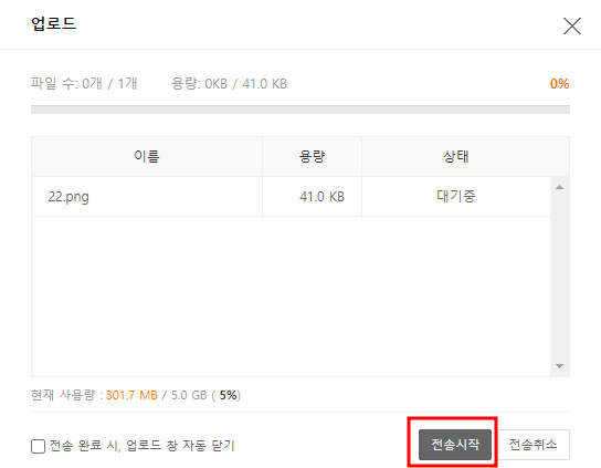 원하는 파일을 선택 후 전송시작을 눌러줍니다.