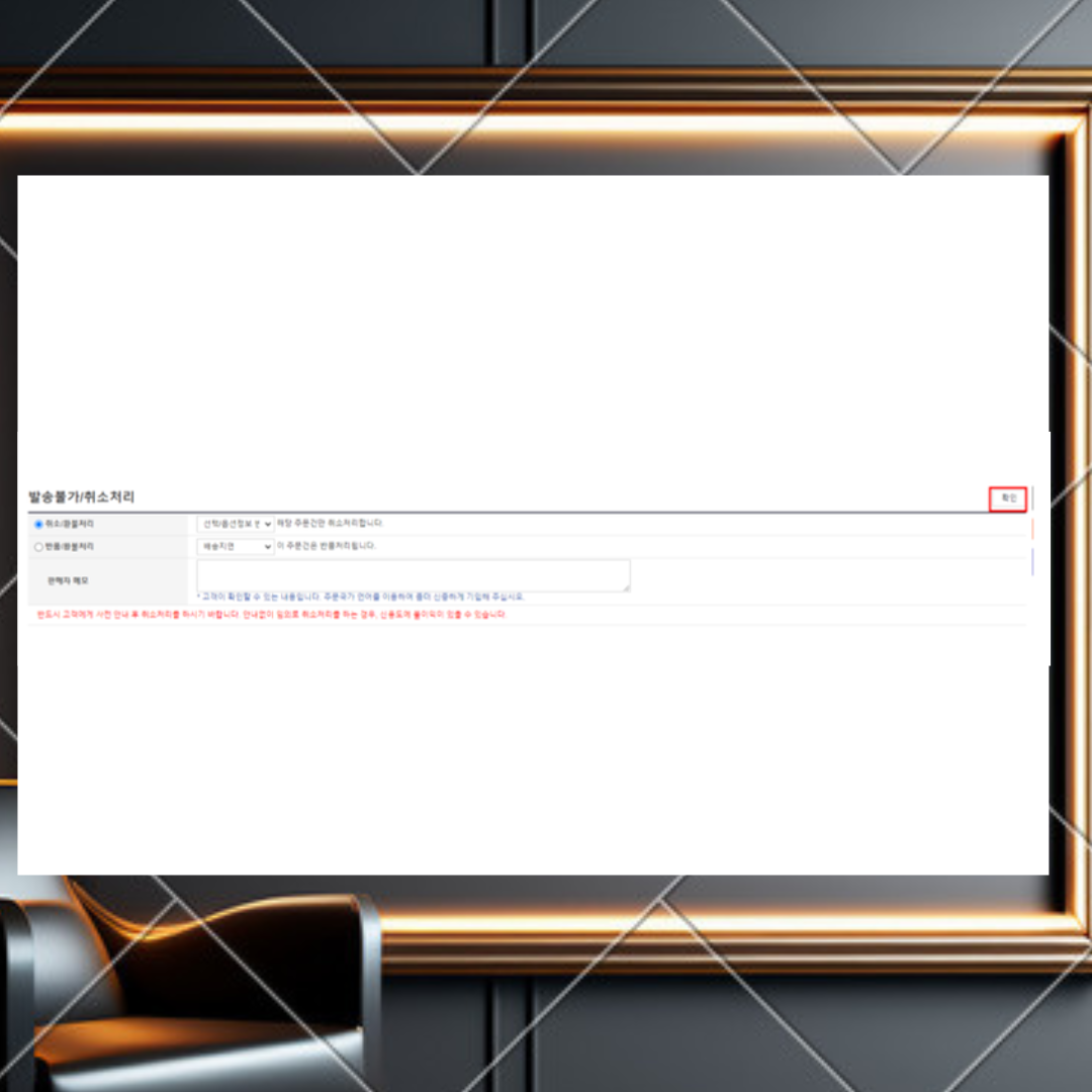 원하는 사유 선택 후 우측의 확인 버튼을 클릭하면 취소 처리가 완료됩니다. 타 쇼핑몰들과 비슷하게 고객에게 사전 안내 후 취소 치리를 진행하게끔 권장고 있습니다. 임의 취소 및 잦은 취소 처리는 페널티나 판매자 점수에도 영향을 끼칠 수 있으니 가능하면 주문이행을 잘해주시는 것이 좋습니다.