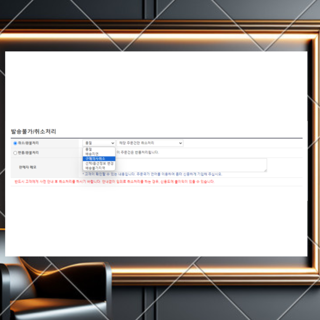 취소 환불처리 탭을 살펴보면 사유에는 품절, 배송지연, 구매의사취소, 옵션정보변경, 배송불가지역 등이 있습니다. 옵션정보 변경은 각 제품마다 설정이 불가능할 수 있어 품절 또는 배송지연 등 상황에 맞는 사유를 선택하여 진행하면 됩니다.