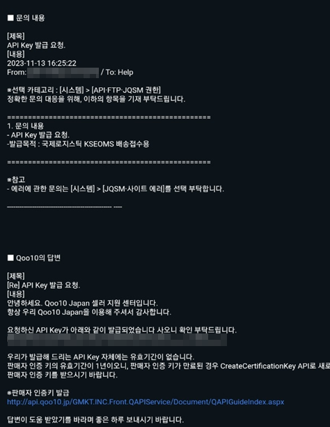몇 분지 나면 바로 api key가 회신이 오는데요, 큐텐이 확실히 문의속도도 빠르고 여러모로 편리한 거 같습니다.