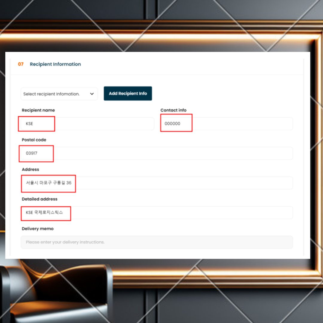 제품을 보낼 상세 주소를 입력해 주세요. 본인 이름 입력 후 주소 등을 잘 기입하여 입력합니다.
