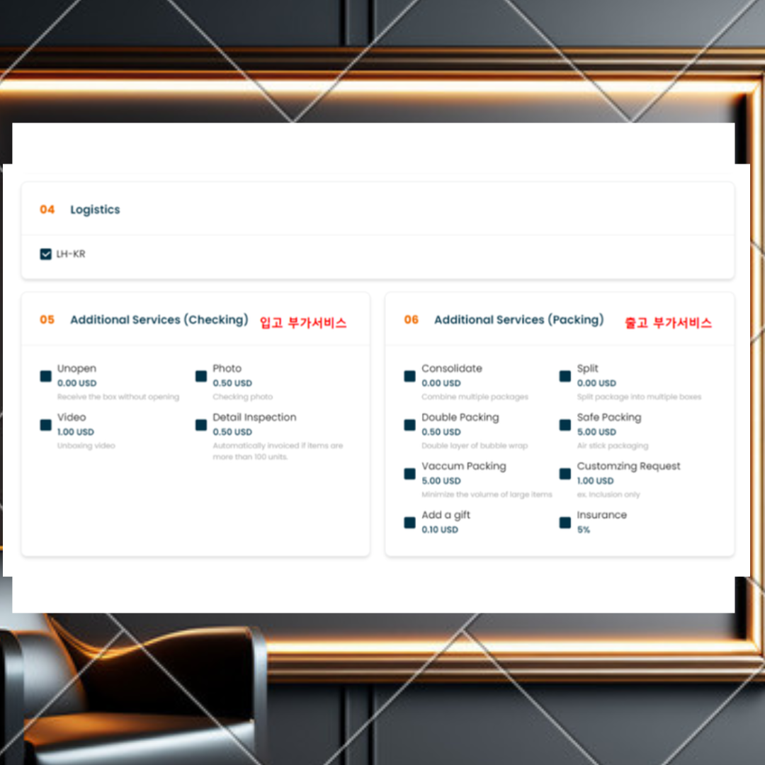 부가서비스로 제품 사진, 비디오 등을 신청할 수도 있고 포장을 보완하거나 사은품 추가 등도 선택할 수 있습니다. 천 원 추가 시 사은품도 추가할 수 있어서, 번거롭지 않고 편하게 이용할 수 있습니다. 매번 사은품을 추가해 잘 이용 중입니다.