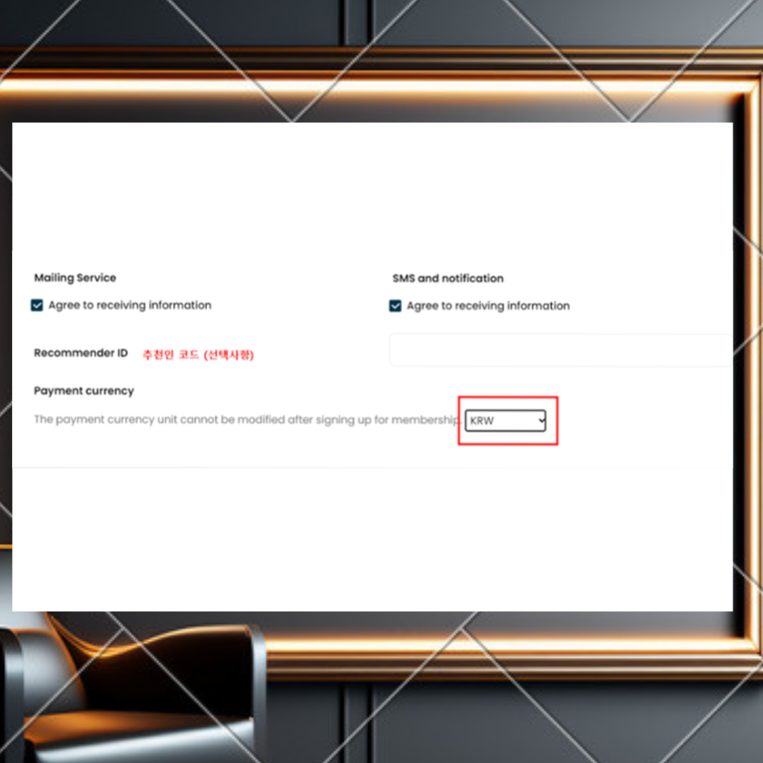 메일과 sms 알림 서비스 선택하고, Recommender ID 추천인 코드가 있다면 입력해 주시면 됩니다. 저는 따로 추천인이 없어서 입력하지 않았습니다. Payment currency 결제 방식은 KRW 원화로 설정하면 됩니다.