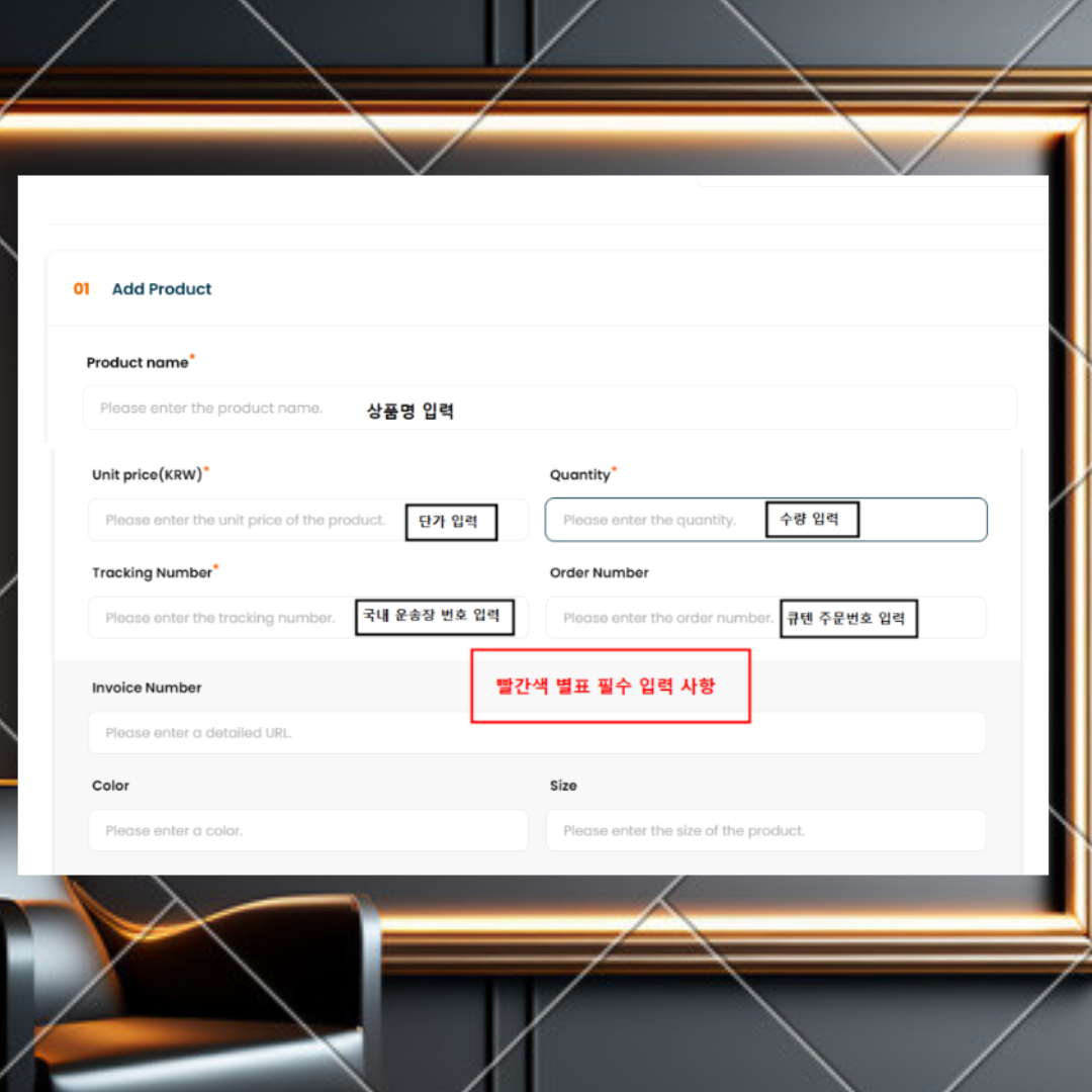 제품 정보를 입력하면 되는데, *표시되어 있는 부분은 필수 입력 사항으로 전부 기입해 주시면 됩니다. Unit price (KRW) 제품 단가를 입력하고, Quantity 제품 수량 입력, Tracking Number 국내 운송장 번호까지 입력해 주면 완료됩니다. 그 외 큐텐 주문번호나 인보이스 넘버 등은 입력하지 않아도 되는데, 제품 구별이 필요한 경우에는 입력하는 것이 좋을 것 같습니다.