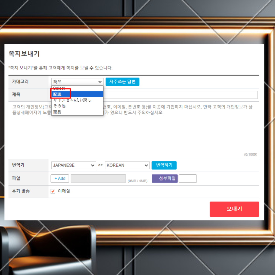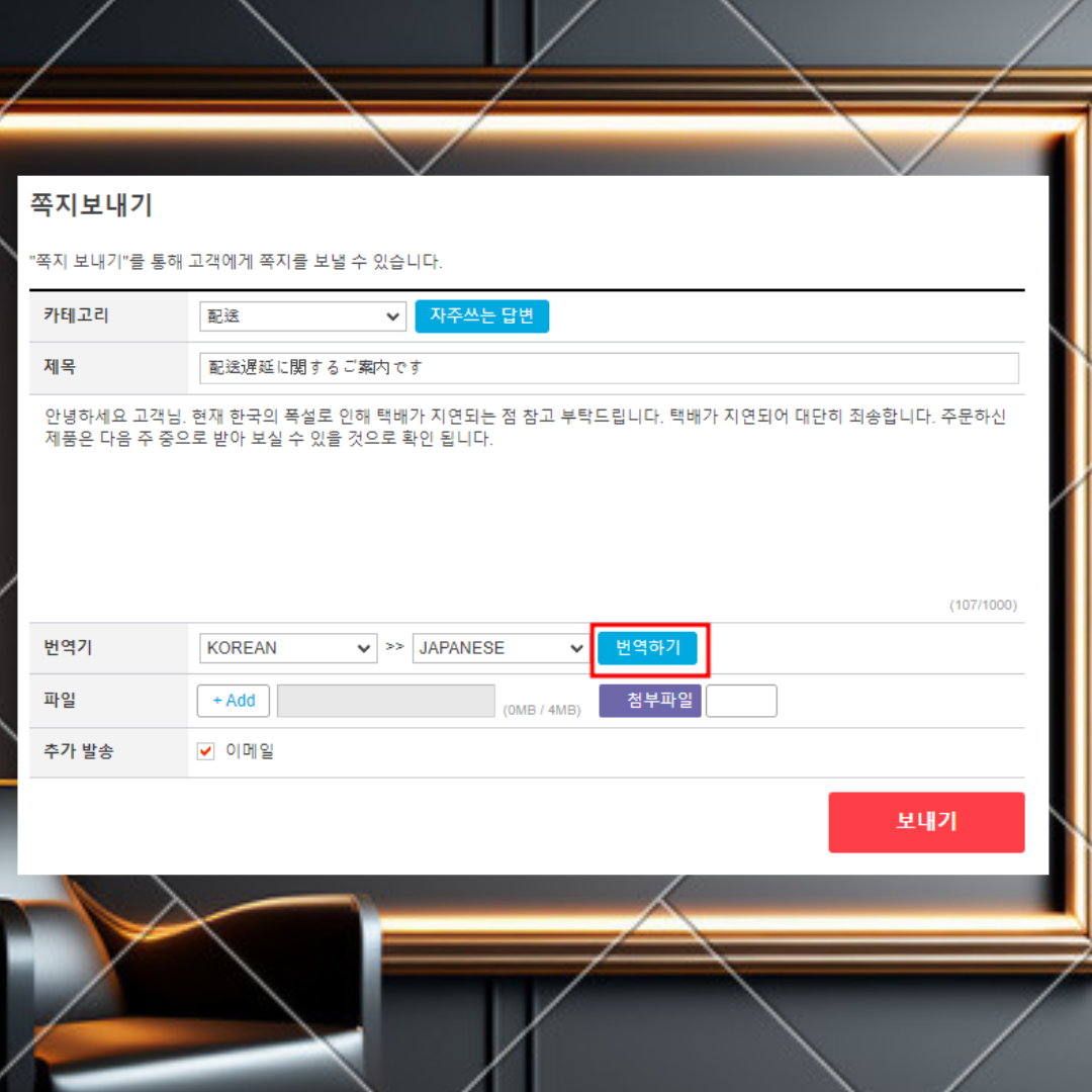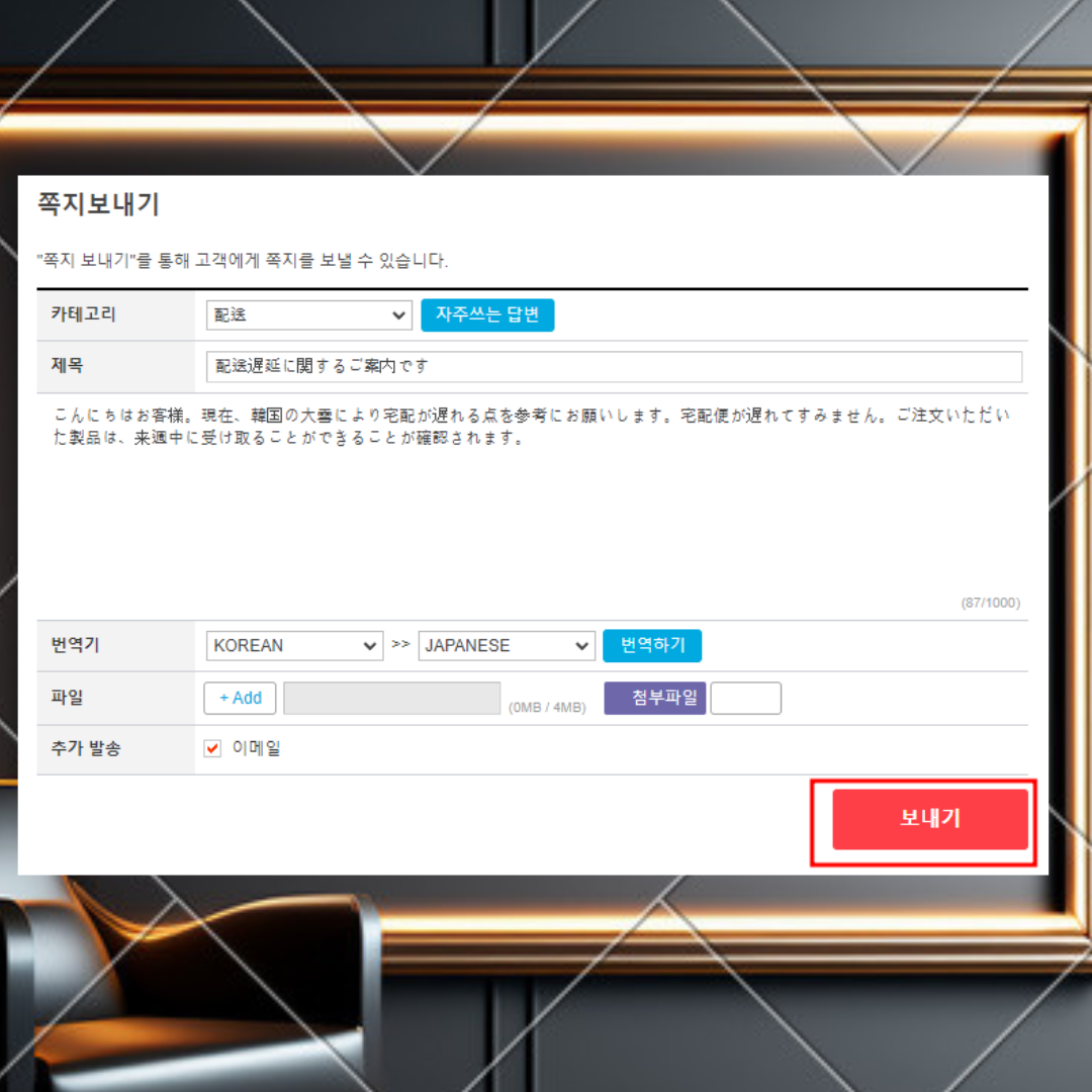 일본어로 잘 번역이 되었다면 보내기를 클릭하면 됩니다. 하단의 추가발송 탭에 이메일이 있는데, 고객에게 쪽지를 보내도 이메일로 함께 전송된다고 합니다. 이중으로 안내가 되니 고객이 놓치지 않고 확인할 수 있을 것 같습니다.