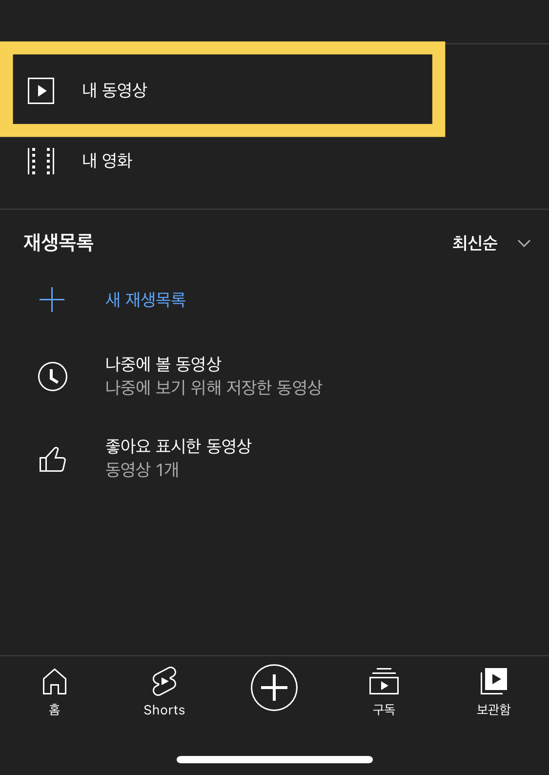 다시 유튜브로 돌아와 우측 하단 보관함 터치 후 내 동영상 들어가기